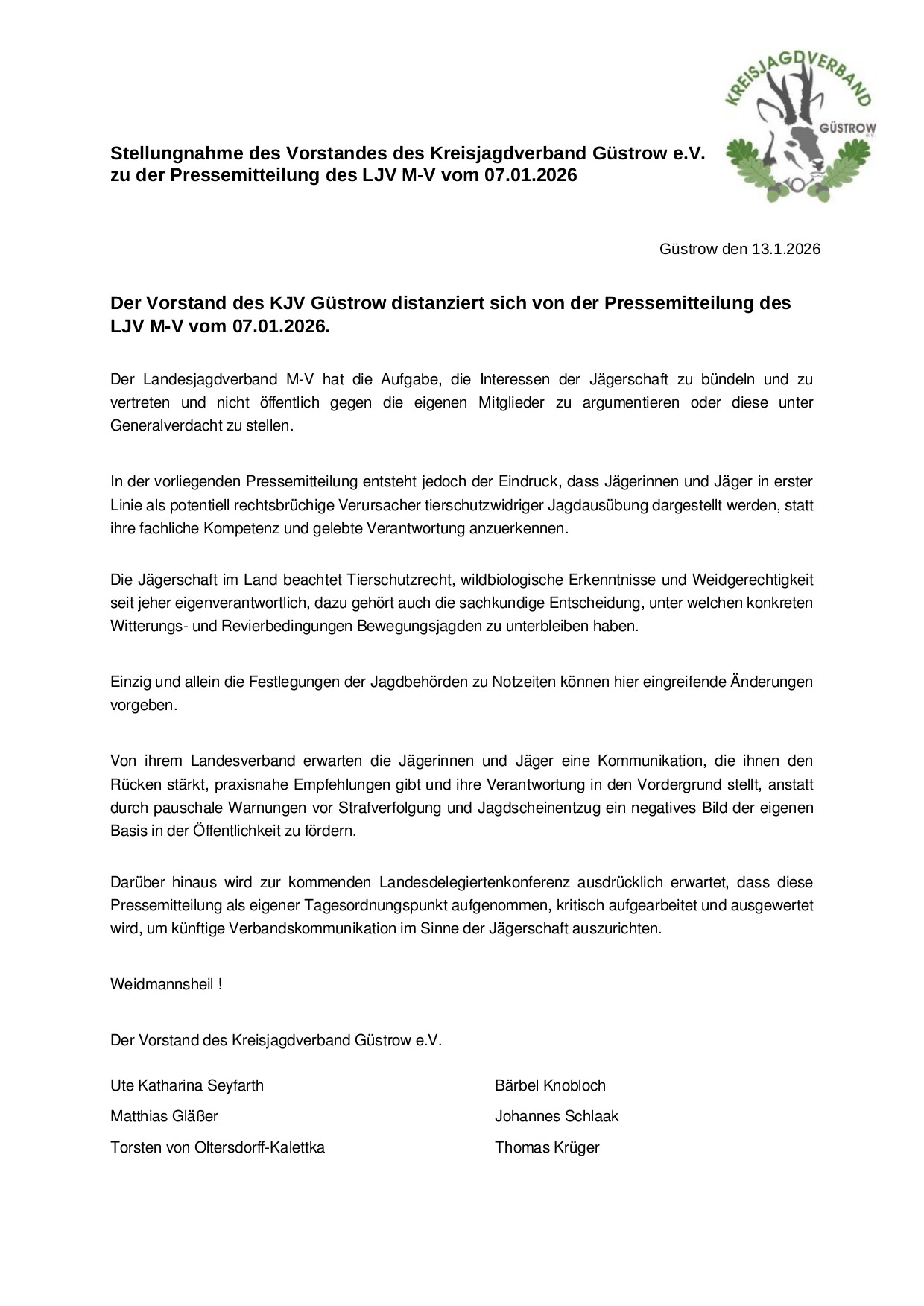 am 7.1.2026 in den Abendstunden haben wir alle die Mitteilung "Witterungsbedingte Einschränkungen der Jagd" über Clubity erhalten. Das der LJV wohl zeitgleich eine Pressemitteilung herausgab wurde uns erst mit dem Beitrag im Nordmagazin am nächsten Tag bewusst. Aufgrund von zahlreichen, teils auch erbosten, Nachfragen von Wdg. haben wir, der Vorstand des KJV Güstrow e.V., uns entschlossen eine Stellungnahme hierzu zu verfassen. Der Vorstand des KJV ist einstimmig der Auffassung das der LJV hier weit über das Ziel hinausgeschossen ist. Eine freundliche Erinnerung und Bitte an die Jägerschaft die gegebenenfalls vorliegenden witterungsbedingten Einschränkungen zu beachten wäre ausreichend gewesen. Wir werden dieses Thema natürlich in aller Form bei dem Präsidium des LJV ansprechen und eine Aussprache in der Landesdelegiertenkonferenz erbitten um die Sicht, nicht nur unseres regionalen Jagdverbandes, darlegen zu können.